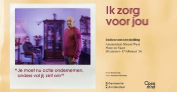 De tentoonstelling ‘Ik zorg voor jou’ reist sinds begin november langs alle stadsdelen. Vanaf woensdag 28 januari is de fototentoonstelling drie weken lang te bezichtigen op de boulevard tegenover de Meervaart. Vanaf 15.30 uur is de feestelijke opening. De middag start bij de tentoonstelling met onthulling door Stichting Open mind en Ton. Hij is een van de 14 geportretteerde mantelzorgers.